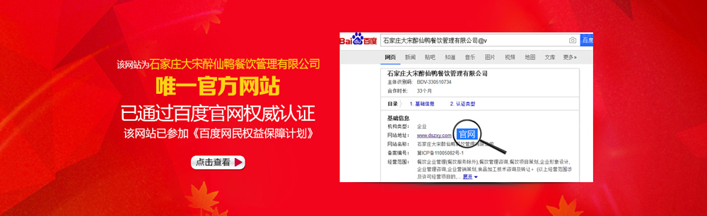 隨著產品的升級,大宋醉仙鴨總部的經營理念不斷提升,經營的規(guī)模不斷擴大,之后又陸續開了多家直營店。2014年3月,石家莊大宋醉仙鴨餐飲管理有限公司正式成立,之后在國家商標總局申請注冊“大宋醉仙鴨”商標。